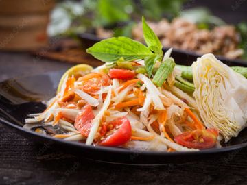 Shredded green papaya with shrimp, tomato, string bean, peanut, chili, carrot, and lime juice.