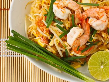 Stir-fried rice noodle with egg, ground peanut, scallion, and bean sprouts.